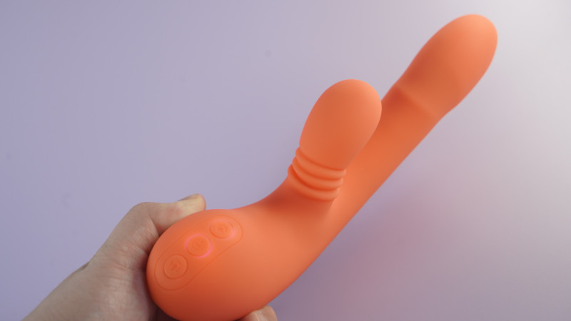 Верхняя кнопка отвечает за включение клторальной части, за включение язычка вращения на 360, единоразовым нажатием на кнопку включения можно управлять дополнительной вибрацией в вагинальной части.